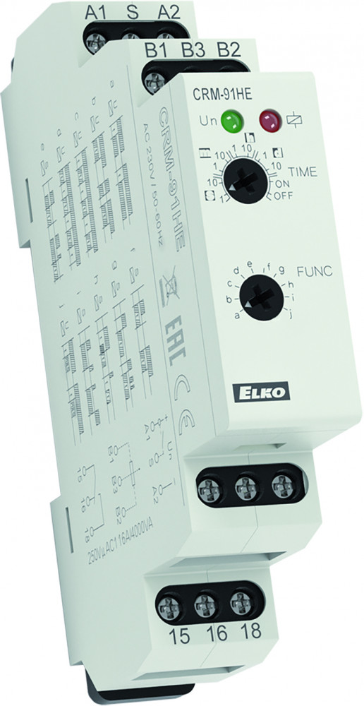 - CRM-91HE/UNI: időállítás külső potenciométerrel; 1x CO, 16 A/AC1 relé kimenete, AC/DC 12 - 240 V táp