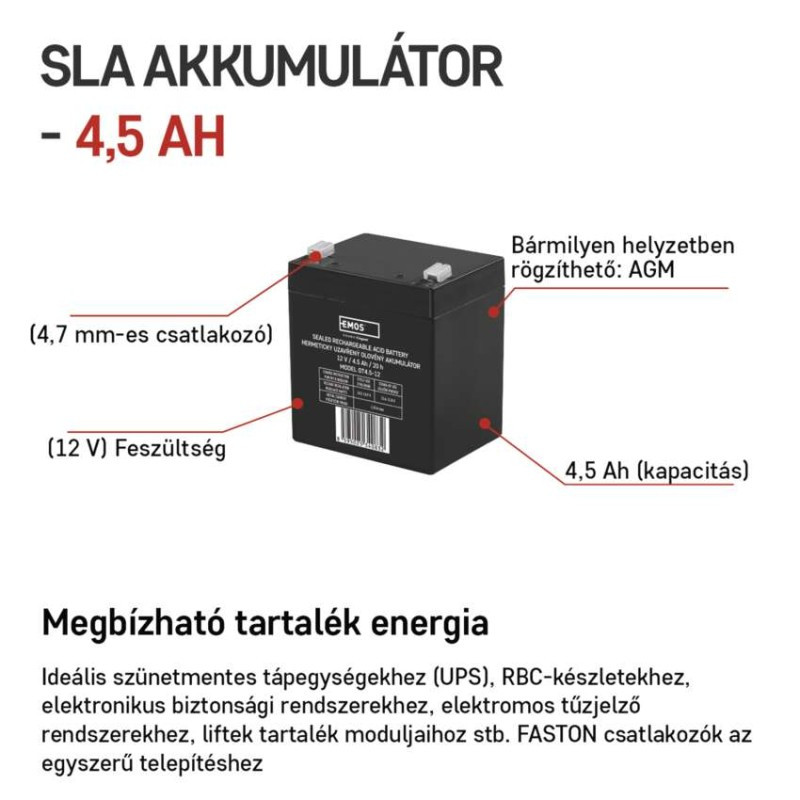 Az EMOS akkumulátor tartaléktelepként használható elektronikus rendszerekhez # biztonsági riasztórendszerekhez, tűzjelző rendszerekhez, liftek tartalék rendszereihez stb. A karbantartást nem igénylő, AGM kivitelű, biztonsági szelepes ólom-savas akkumulátor bármilyen helyzetben használható. Az optimális élettartam szünetmentes tápegységben 5 év.