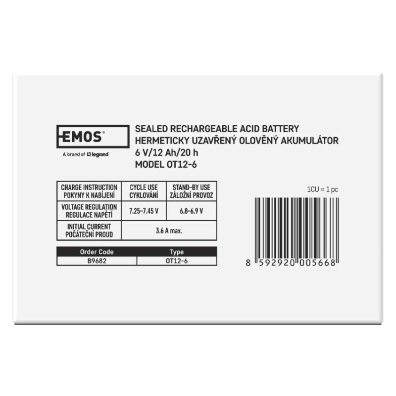 Az EMOS akkumulátor tartaléktelepként használható szünetmentes tápegységekhez, RBC készletekhez stb. A karbantartást nem igénylő, AGM kivitelű, biztonsági szelepes ólom-savas akkumulátor bármilyen helyzetben használható. Az optimális élettartam szünetmentes tápegységben 5 év.