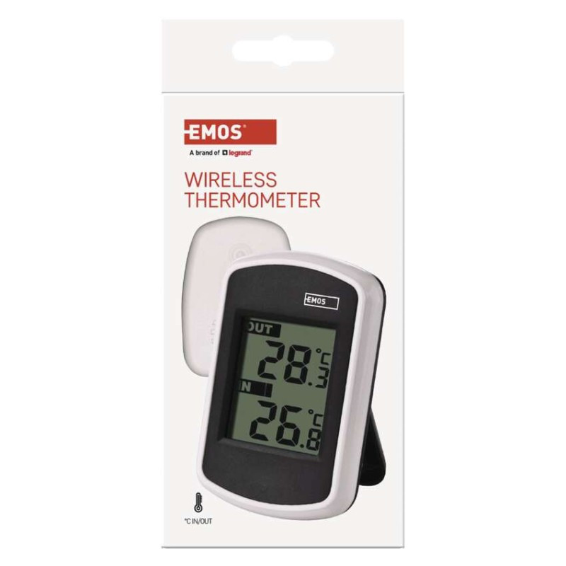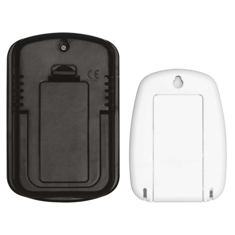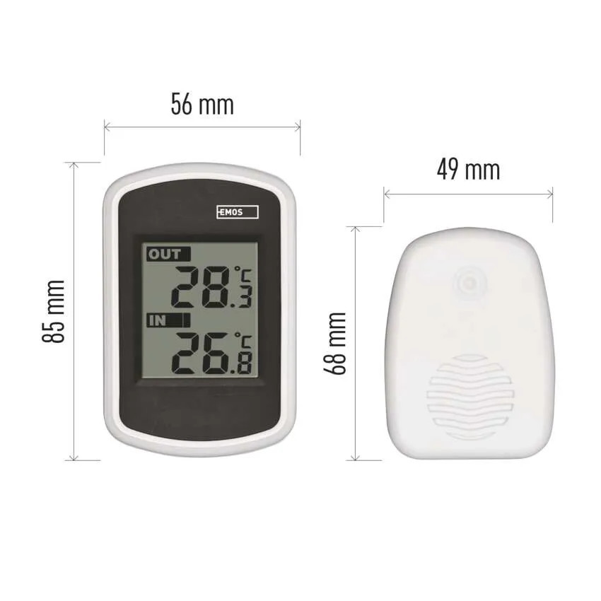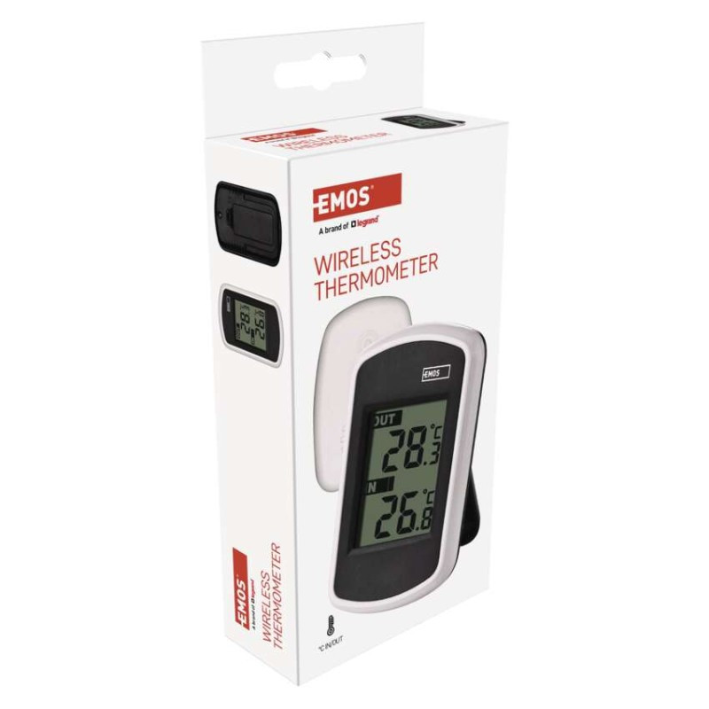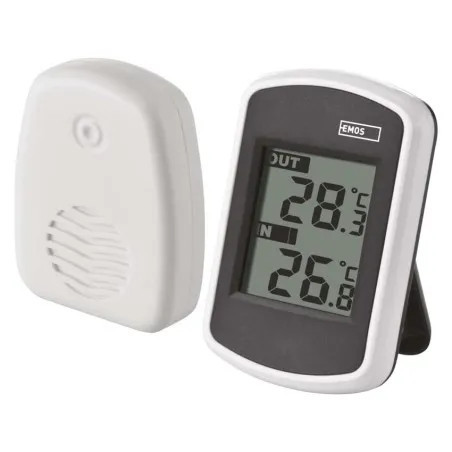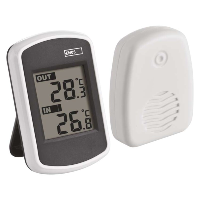 Vezeték nélküli hőmérő a beltéri és kültéri hőmérséklet kijelzésével. A hőmérő 100 m hatótávolságú vezeték nélküli érzékelővel rendelkezik. Belső hőmérséklet: 0 °C és +60 °C, felbontás 0,1 °C. Külső hőmérséklet: -40 °C és +60 °C, felbontás 0,1 °C.
