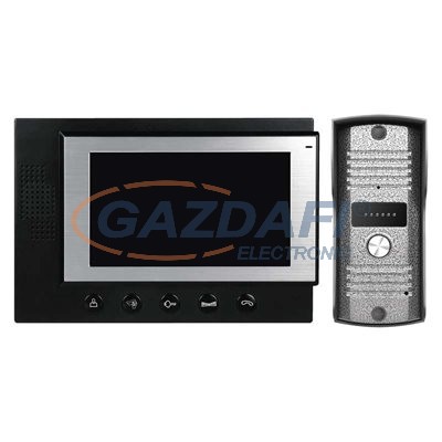 Egyszerű videótelefon-rendszer ajtóhoz. A kép nagy, 7#-es, színes LCD kijelzőn jelenik meg. Az eszköz áramellátásáról 12 V-os adapter gondoskodik. Az eszköz segítségével vezérelhető egy ajtózár és egy csúszókapu