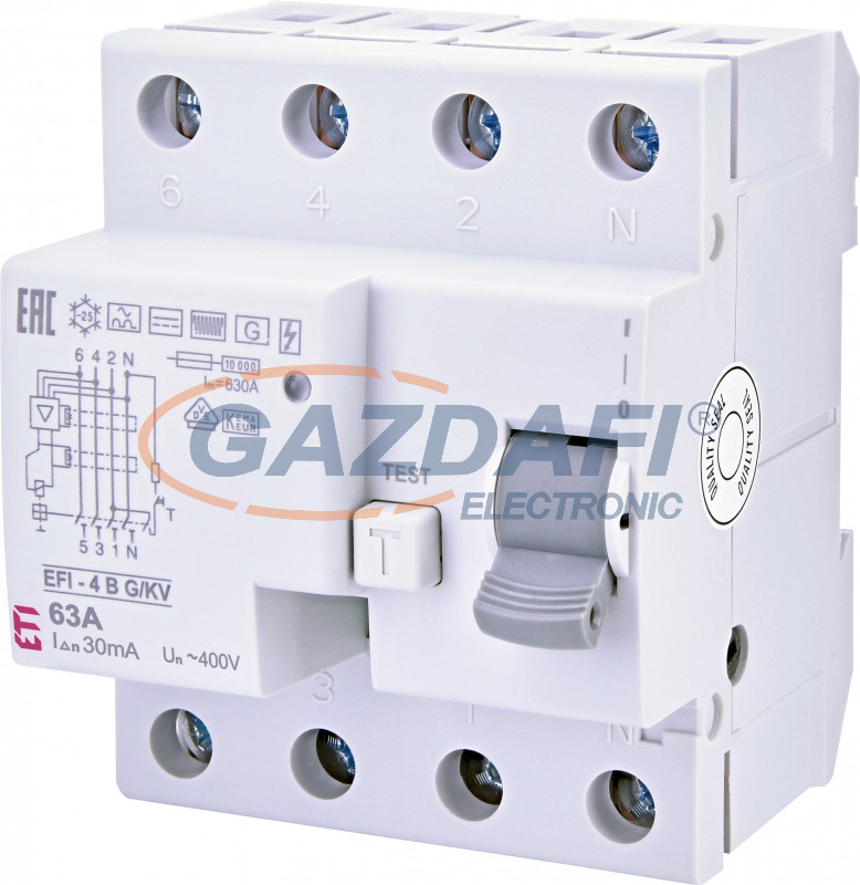 ETI 002062654 EFI-4 B G/KV 63A 30mA áram-védőkapcsoló, 4p, váltó, pulzáló, egyen és nagy frekvenciás (1kHz) hibaáramot érzékelő, rövid késleltetésű (Fi-relé)