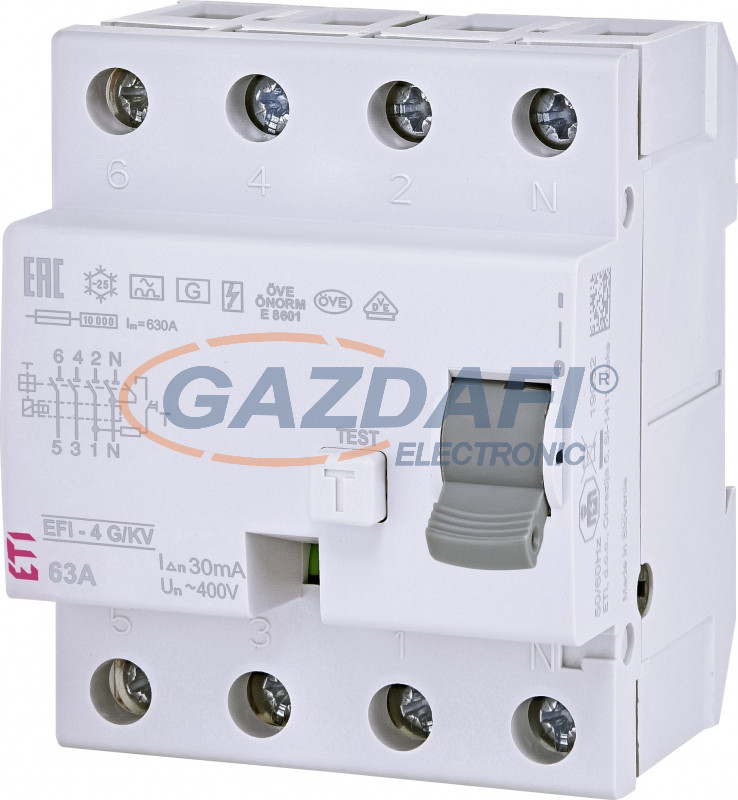 ETI 002062749 EFI-4 A G/K 63A 30mA áram-védőkapcsoló, 4p, váltó és pulzáló hibaáramot érzékelő, rövid késleltetésű (Fi-relé)