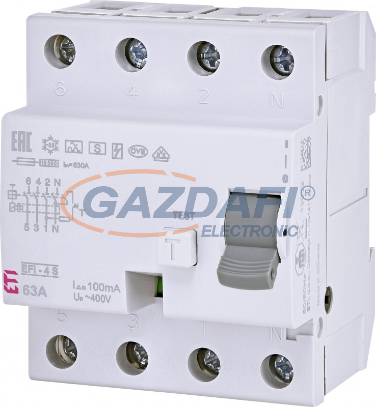 ETI 002063754 EFI-4 A S 63A 100mA áram-védőkapcsoló, 4p, váltó és pulzáló hibaáramot érzékelő, késleltetett kioldású (Fi-relé)
