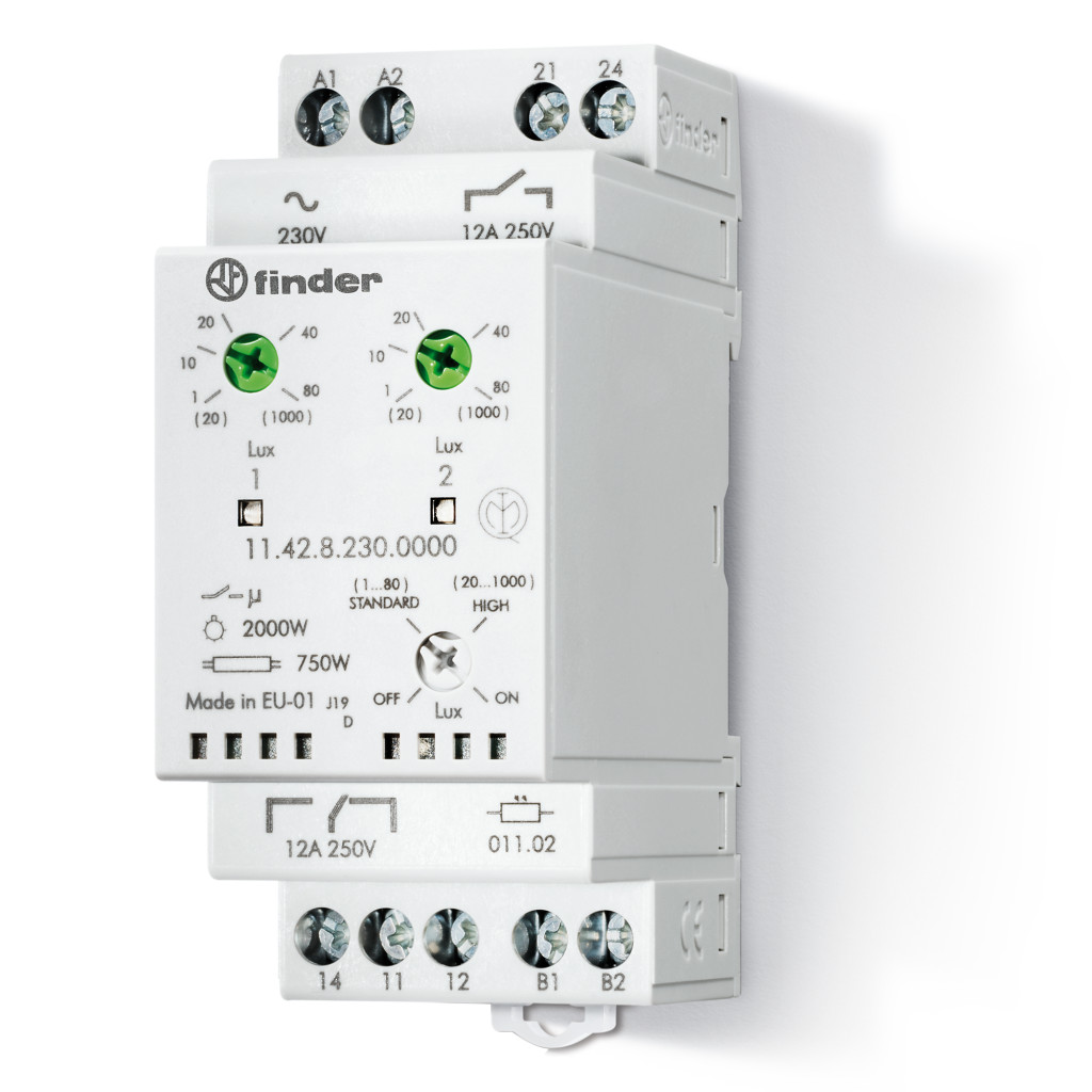 Sorbaépíthető fénykapcsoló (alkonykapcsoló), 1 váltóérintkező + 1 záróérintkező 12 A - 250 V AC (AC1), bemenet és kimenet galvanikusan elválasztott, max. terhelhetőség (230 V AC): AC15: 750 VA, érintkezőterhelés: izzó- / halogénlámpa: 2.000 W, kompakt fénycső: 400 W, LED (230 V AC): 400 W, kisfesz. halogénlámpa vagy LED elektronikus előtéttel: 400 W, kisfesz. halogénlámpa vagy LED hagyományos előtéttel: 800 W, fénycső elektronikus előtéttel: 1.000 W, fénycső hagyományos előtéttel: 750 W, LED-es állapotjelzés, 2 megszólalási tartomány állítható: (1...80) lx vagy (20...1.000) lx, készülékszélesség 35 mm, tápfeszültség: 230 V AC, külső fényérzékelő: 011.02 (IP 54, 1 db tartozék)