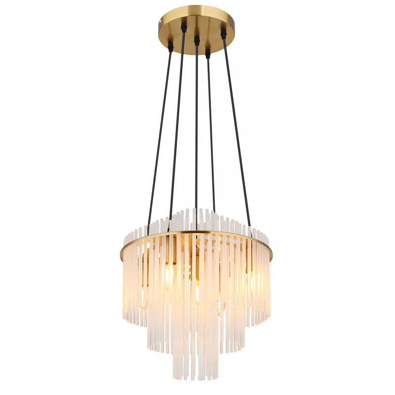 Függőlámpa, fém arany színű matt, fehér/átlátszó színátmenetes üvegrudak, kábel PVC fekete, magassága rövidíthető, ø: 400mm, M: 1200mm, 5x E14 40W 230V izzók nélkül