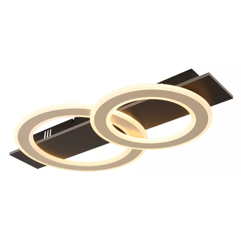 Mennyezeti lámpa, fém fekete matt, MDF sötétbarna szálcsiszolt, fém pezsgőszínű szálcsiszolt, akril fehér, HxSzxM: 630x350x70mm, gyűrűk ø: 1 x 35 cm és 29 cm, tartozék: LED 40W 230V, 3800lm forrás, 2000lm kimenet, 3000K