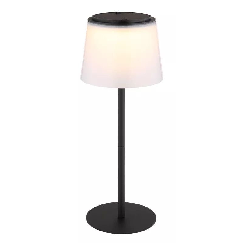 Asztali lámpa fém fekete, műanyag fekete/szatírozott, érintéses be/ki, fényerőszabályzó, memória, adapter nélkül, CR18650 1800mAh 3,7V, IP44, töltés/világítás: 3/3 óra, ø:130mm, 2 magasság: 34cm/21cm, LED 1,8W 230V, 220lm forrás, 150lm kimenet, 3000K
