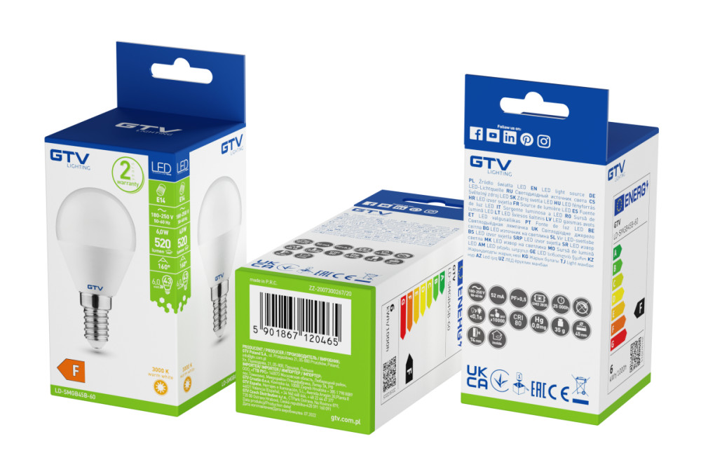 Gyártó GTVÉlettartam 25 000,40000 óraEnergiaosztály 2023- GFényáram 200 lmFoglalat E14Gyártói cikkszám LD-SMNGB45B-60Névleges áramerősség 33, 52Névleges feszültség 220-240 VNévleges frekvencia 50/60 HzSzínhőmérséklet 4 000 KTeljesítmény 6WTípus LED izzóVetítési szög 120 °Gyártó GTV LIGHTINGNumero articolo GTV-LD-SMNGB45B-60