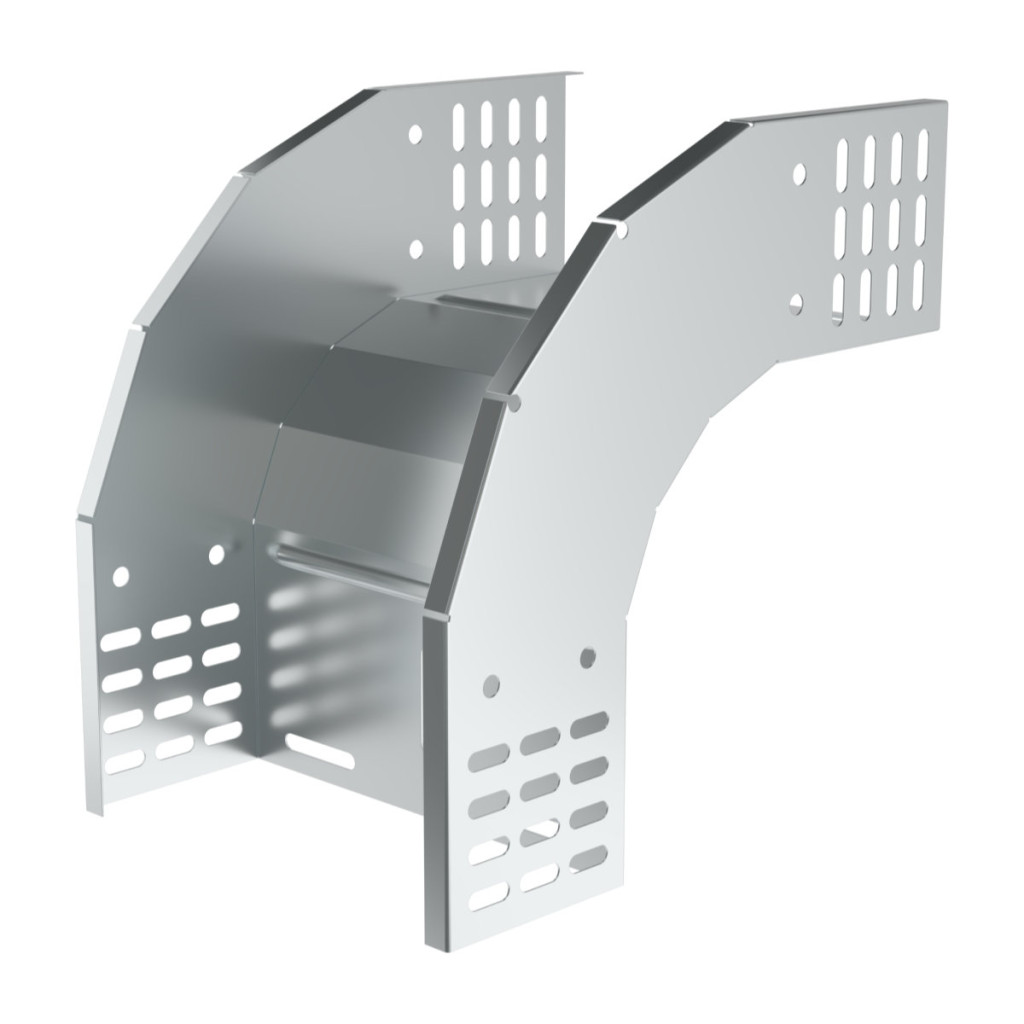 Low elbow for bending of the route in vertical direction at the angle of 90° in decreasing direction. Elbow is intended for cable trays with width 85x200, superficial treatment sendzimir, for connection of elbow and cable tray it is not necessary to use special connectors.