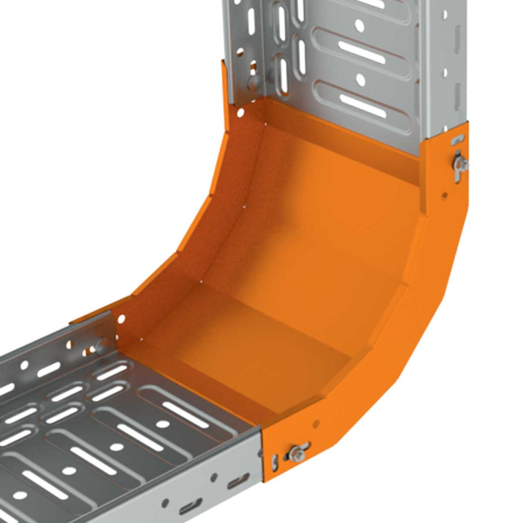 Rising elbow 90° for cable tray 100x500 mm, surface treatment hot dip galvanized. The rising elbow is designed for the transition of the cable route to the vertical direction with 90°.