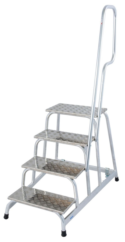 A könnyű, gurítható alumínium szerelődobogó csúszásmentes fokokkal és kapaszkodóval ideális a fokozott igénybevételt jelentő felhasználási területeken.