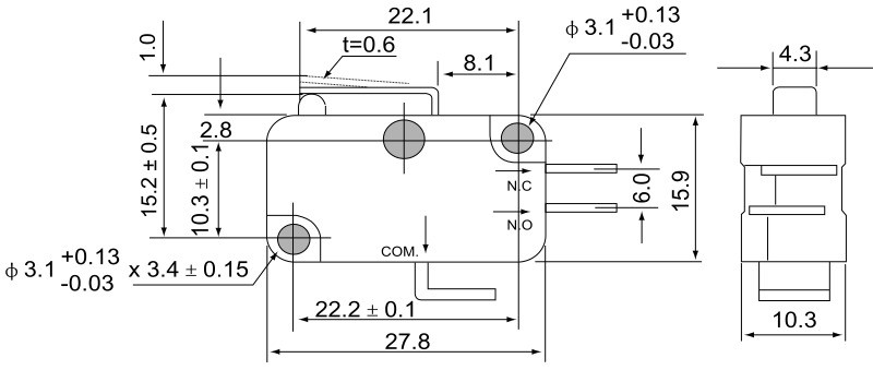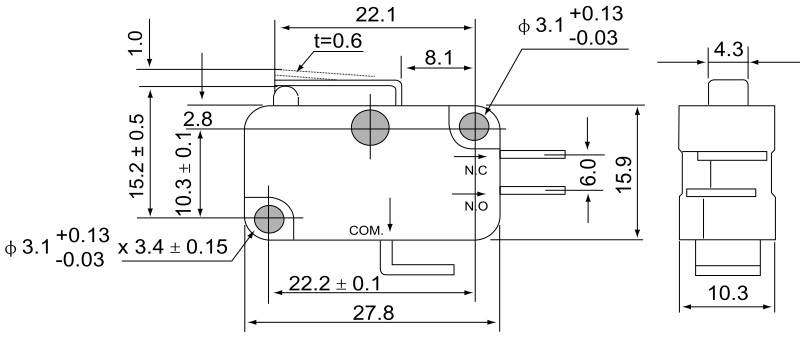 TRACON KW3-15 Helyzetkapcsoló, mikro, rugószáras 1×CO 10A/230VAC, 0,3A/250VDC, 15mm, 4,8x0,5 mm, IP00