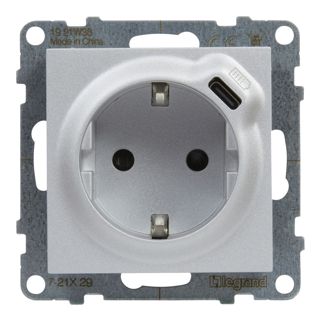 LEGRAND 721329 Suno 2P+F + USB-C dugalj csatlakozóaljzat (rugós), biztonsági zsaluval, alumínium