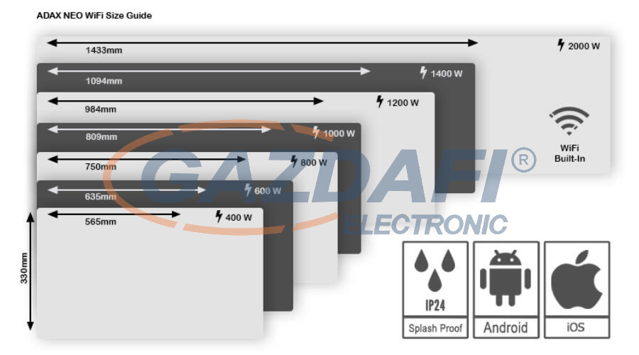 Adax Neo Wifi NW14 fűtőpanel, 33x110 cm, fém előlap, 1400 W általános leírása: