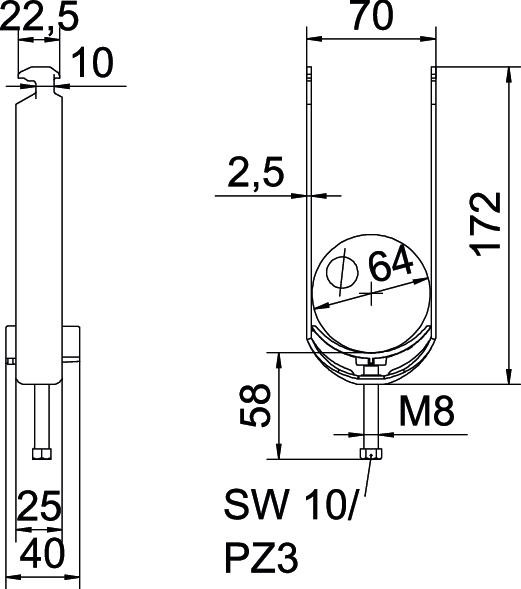 Kengyeles bilincs kalapácsfejes kivitel, polipropilén műanyag nyomóvályúval. Függőleges és vízszintes szereléshez 2 kábel részére C profilsínen. Résszélesség 16 - 17 mm. Egymenetes csavar a nyomóvályún, univerzális hatlapfejű csavarfej SW10/PZ3 kereszthoronnyal. Kültéri és beltéri szereléshez alkalmas. A kábeleket kettes nyomóvályúval el kell választani egymástól. Ellendarab használata ajánlott.