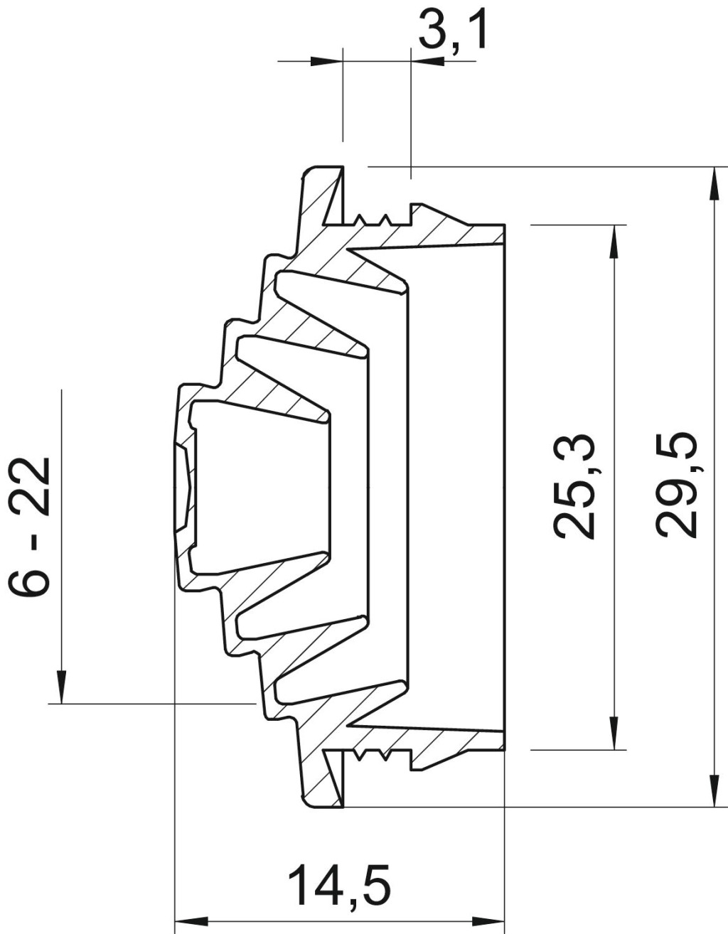 A lépcsős kábelátvezető záródugó megfelelő helyen levágva a mindenkori kábelátmérőhőz igazítható.