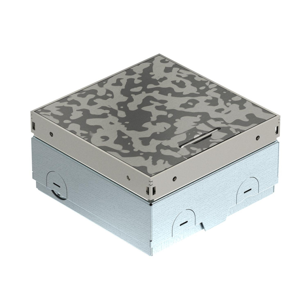 A négyzet alakú padlódoboz beltéri, száraz ápolású illetve esztrich padlókhoz alkalmazható. Beépíthető ház kikönnyített bevezetőnyílásokkal védőcsövekhez (M20/M25). A fedél 4 szintezőlábbal a padlóburkolat felszínéhez állítható. Minimális beépítési mélység 75 mm, szintezési tartomány + 30 mm. A burkolatból kilátszó keret és fedél rozsdamentes acélból készül. Telelemezes fedél A 15 kN-os teherbírás csak használaton kívüli állapotban garantált. Üres ház, egy Modul 45®-ös készülékhez és egy adatátviteli csatlakozóaljzathoz. Szállításkor egy zárólappal le van zárva.