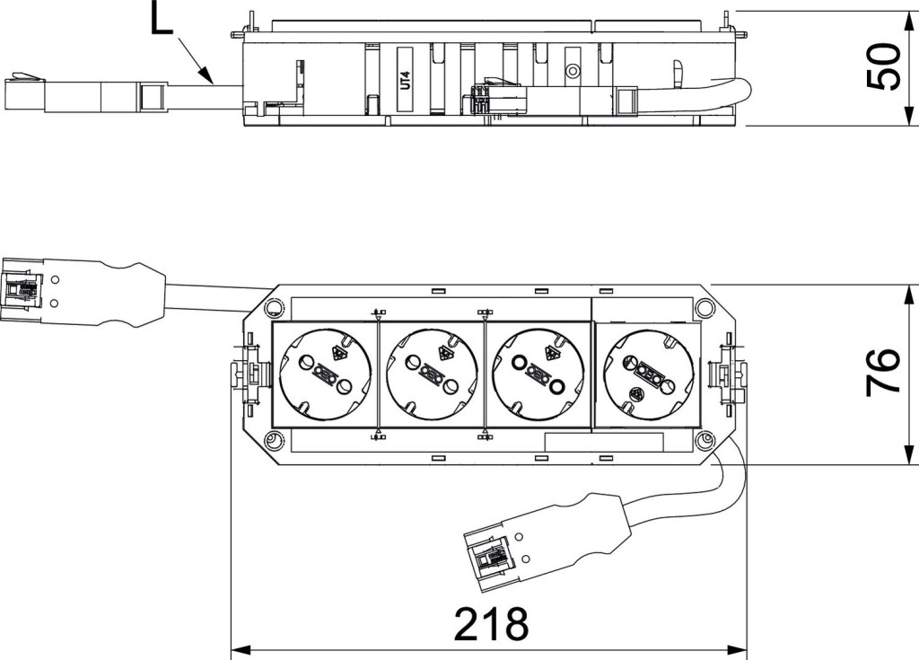 UTC4 csatlakoztatásra kész komplett egység, 3 db előszerelt fehér 33°-os védőérintkezős csatlakozóaljzattal és 1 db előszerelt 33-os védőérintkezős csatlakozóaljzattal rendelkezik, narancs színben, 250 V~ 16 A, halogénmenetes csatlakozóvezetékkel. Alkalmas VL típusú csatlakozó vezetékek és R7 és R9 és 9 névleges méretű szerelvénybeépítő egységek csatlakoztatására.