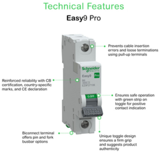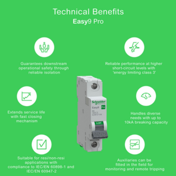 Az Easy9 Pro, az Easy9 család legújabb tagja, a legmagasabb szintű elektromos védelmet nyújtja, miközben megfelel a különböző projektek követelményeinek. Ideális lakossági környezetben, valamint kis- és közepes kereskedelmi épületekhez (pl. éttermek, gyógyszertárak, élelmiszerboltok, kiskereskedelmi üzletek).