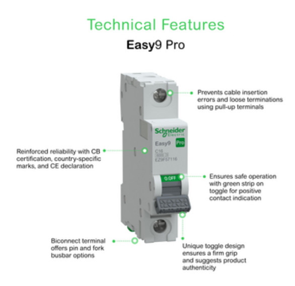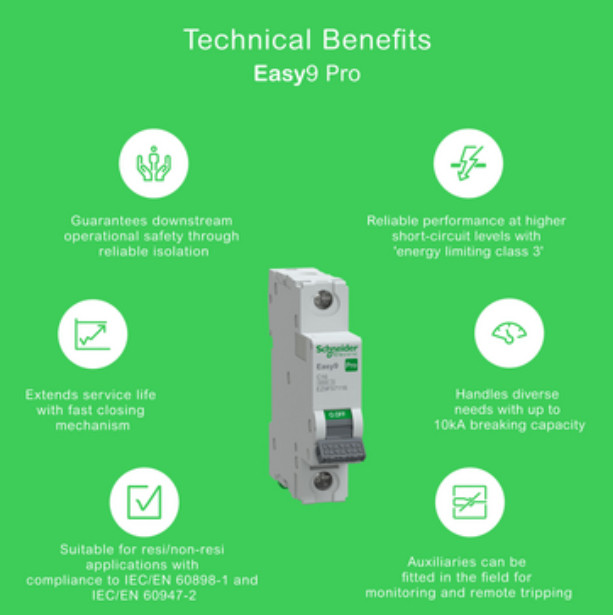 Megfelel az MSZ/EN 60898-1 szabványnak. A készüléken található zöld sáv az érintkezők fizikai nyitását jelzi. Ez a készülék elszigetelésre alkalmas. Lehetővé teszi a biztonságos működtetést a terhelésoldali áramkörön. A megbízhatóság jegyében a készülék mechanikai tartóssága legfeljebb 20000 ciklus, elektromos tartóssága pedig legfeljebb 10000 ciklus. Moduláris telepítéshez a készülék DIN sínre szerelhető. A szennyezettségi fok 3. Energiakorlátozási osztálya 3. osztály. A szekrényben IP20 és IP40 védettségi fokozatú. Az üzemi hőmérséklet -30-70°C. Az Easy9 Pro termékcsalád kialakítása révén könnyen illeszkedik a különböző alkalmazásokhoz és projekttípusokhoz.