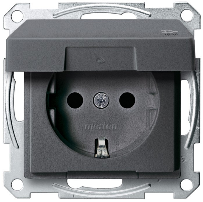 MERTEN 2P+F csatlakozóaljzat, biztonsági zsaluval, csapófedéllel, csavaros bekötés, 16A, System-M, antracit - IP44