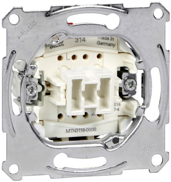 A Schneider Electric Merten MTN3116-0000 egy 1 billenőkapcsolós betét. A készülék rögzítése csavarokkal és körmökkel történik. Névleges áramerőssége: 10 AX. Falba süllyesztve lehet beszerelni. IP20-as védettséggel rendelkezik. A kapcsoló fémből, műanyagból készült, így a lehető legnagyobb mértékben ellenálló. Ráadásul ez a készülék zöld prémium termék, mivel nem tartalmaz veszélyes anyagot. Higanymentes A Merten betétek bármilyen hagyományos 60-as dobozban használhatók, kiemelő keretekkel vagy akár IP44-es megoldások esetén is, szinte minden helyen. A Merten betétek kombinálhatók a Merten System M, a System D fedlapokkal és keretekkel.
