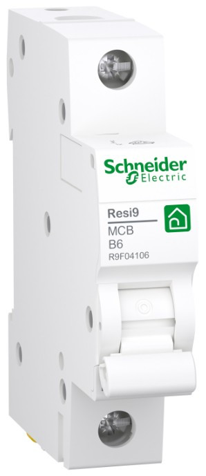 Ez a termék egy Resi9 kisfeszültségű kismegszakító/automata (MCB). Ez az 1P,2P,3P,4P kismegszakítók C és B kioldási görbével. Az Icn névleges rövidzárlati megszakítókapacitása legfeljebb 4,5kA 230 V-os váltóáram esetén, az EN/IEC 60898-1 szabványnak megfelelően. Ez a termék megfelel az EN/IEC 60898-1 szabványnak. Ez a kismegszakító védi az áramkört a rövidzárlattól és a túlterheléstől is egyaránt. A Resi9 kettős csatlakozású alsó betáplálási rendszerű, amely a villás fésűs gyűjtősíneknek köszönhetően minimalizált huzalozást igényel. A Resi9 az egyik legelterjedtebb lakossági/kivitelezői és társasházakban használt kismegszakító/automata Magyarországon.Elektromos élettartama akár 4000 ciklus is lehet, mechanikai élettartama pedig akár 10 000 ciklus is lehet. Az Ue üzemi feszültség 230 V~. Az Ui névleges szigetelési feszültség 440 V~. Az üzemi frekvencia 50 Hz vagy 60 Hz. A terméket DIN sínre lehet felszerelni. Szélessége 1,2,3,4 modul. A termék színe fehér (RAL9003). A méret (szélesség) 18 mm x (magasság) 85 mm x (mélység) 75 mm. Az IEC 60529 szabvány szerint a szekrényben IP20 és IP40 védettségi fokozatú. Az üzemi hőmérséklet -25°C és 60°C között van. Tárolási hőmérséklet: -40-80°C. A terméket az európai uniós piacok területén az adott hulladékgyűjtési szabályozásnak megfelelően kell leselejtezni, és nem szabad a háztartási hulladékba dobni.