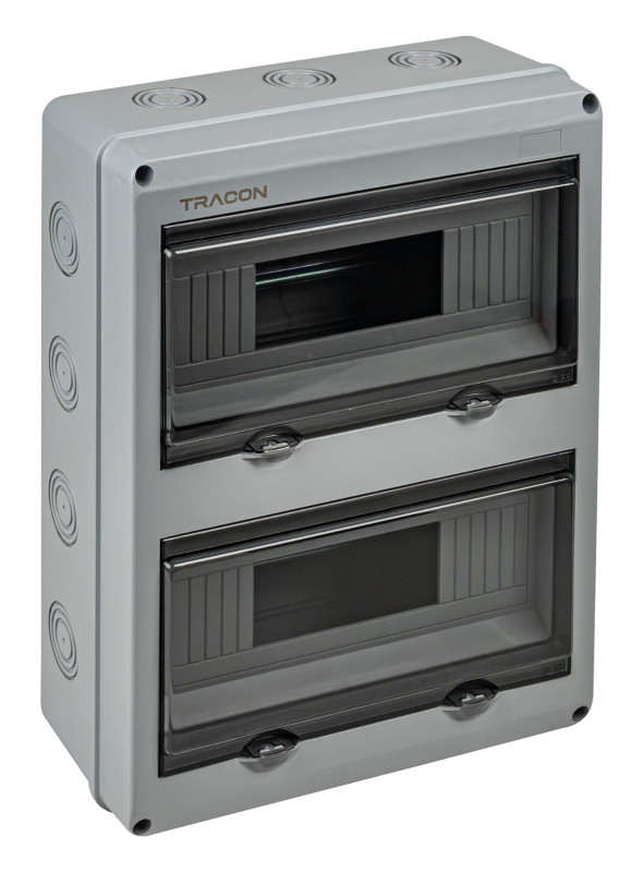 TRACON EDFKIP65U122 Falon kívüli elosztódoboz, átlátszó ajtóval, N/PE sínnel 2×12 mod, H×W×D=356.16×275.51×106.2mm, IP65,1000VAC,1500 VDC