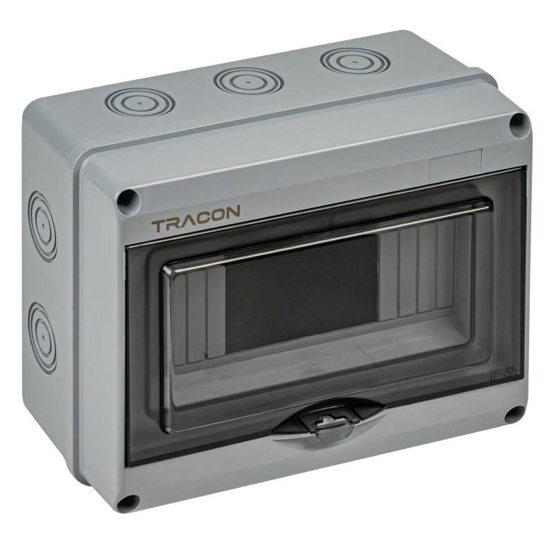 TRACON EDFKIP65U81 Falon kívüli elosztódoboz, átlátszó ajtóval, N/PE sínnel 1×8 mod, H×W×D=154.5×200.5×88.9mm, IP65, 1000 VAC, 1500 VDC