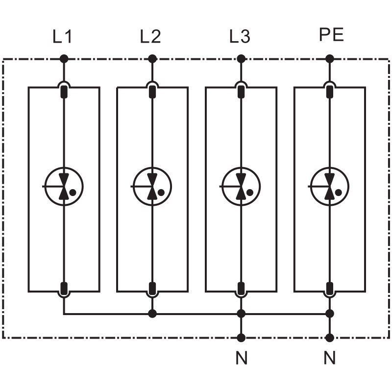 Védelmi szint < 4 kV, a beépítés szokásos helye: főelosztó - T2 típus: túlfeszültség-levezetők