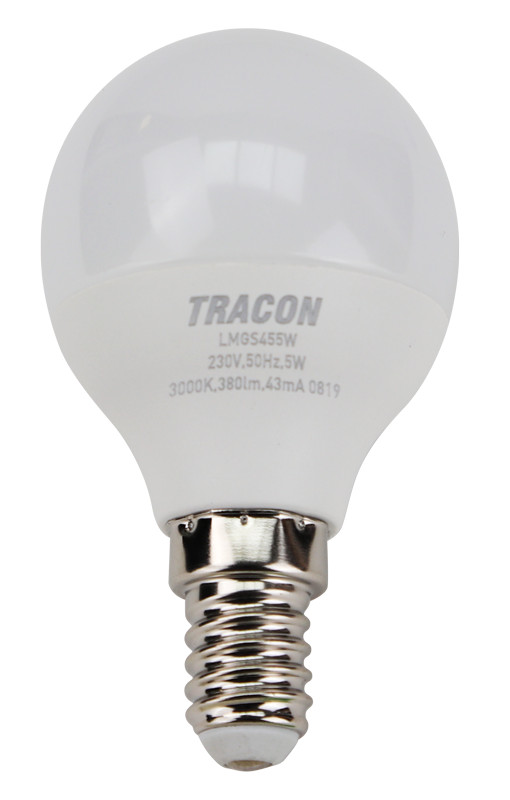 TRACON LMGS455NW Gömb burájú LED fényforrás SAMSUNG chippel 230V,50Hz,5W,4000K,E14,460 lm,180°,G45,SAMSUNG chip, EEI=F