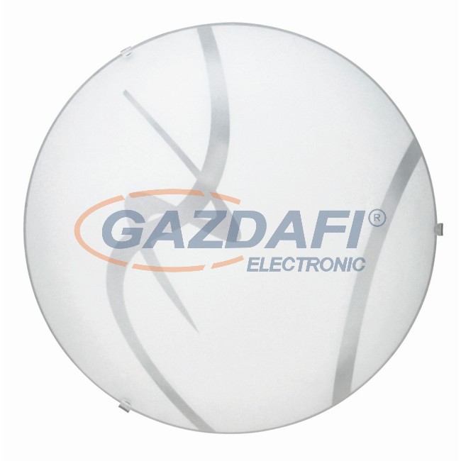 40 cm átmérőjű, retro megjelenésű, geometrikus formákkal díszített mennyezeti lámpa. Fém és műanyag szerkezet, mintás opálüveg lámpabúrával. 2 darab E27-es foglalatában maximum 60W teljesítményű, halogén vagy LED fényforrással használható.
