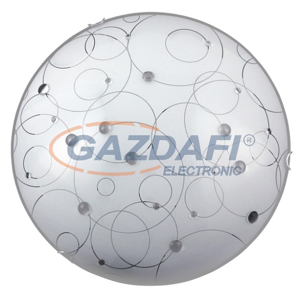 50 cm átmérőjű, modern megjelenésű mennyezeti lámpa, fém és műanyag szerkezettel, kiváló minőségű, 3D hatású, üveggyöngyözött, fehér alapszínű, mintás lámpabúrával. 3 db E27-es foglalatában maximum 3x 40W teljesítményű, halogén vagy LED fényforrásokkal is használható. Kialakításának köszönhetően a fényforrások cseréje, illetve a lámpatest tisztítása gyorsan és egyszerűen elvégezhető.