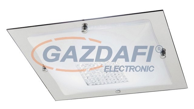 Modern, egyben minimalista megjelenésű mennyezeti lámpa áttetsző üveg és tükrös felületekkel, 42 x 42 cm-es méretben. A lámpatest 3 db E27-es, maximum 40W teljesítményű kompakt vagy akár LED fényforrásokkal is működtethető. Az IP20-as védettséget kínáló szerkezet kialakításának köszönhetően a fényforrások cseréje és a lámpatest tisztítása könnyen elvégezhető.