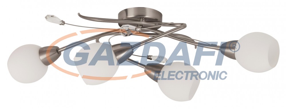 Időtlen stílusú mennyezeti lámpa 4 foglalattal. 65 cm átmérőjű, szatin króm színű fémből készített lámpatest fehér opálüveg lámpabúrákkal, IP20-as védelemmel. A lámpatest E14-es foglalatú, max. 4x 40W teljesítményű halogén vagy energiatakarékos fényforrásokkal használható.