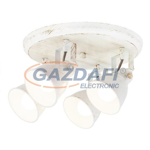 Vintage stílusú mennyezeti spotlámpa 4 db foglalattal. 30 cm átmérőjű, antik fehér színű fém lámpatest és pozícionálható lámpabúrák. A mennyezeti lámpa E-14-es foglalatú, max. 4x 40W teljesítményű energiatakarékos fényforrásokkal is használható.