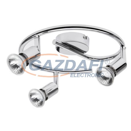 Modern megjelenésű mennyezeti spotlámpa 3 db foglalattal. 25 cm átmérőjű, króm színű, fémből készített lámpatest és pozícionálható lámpabúrák. A lámpatest GU10-es foglalatkialakítású, max. 3x 50W teljesítményű energiatakarékos fényforrásokkal is használható.
