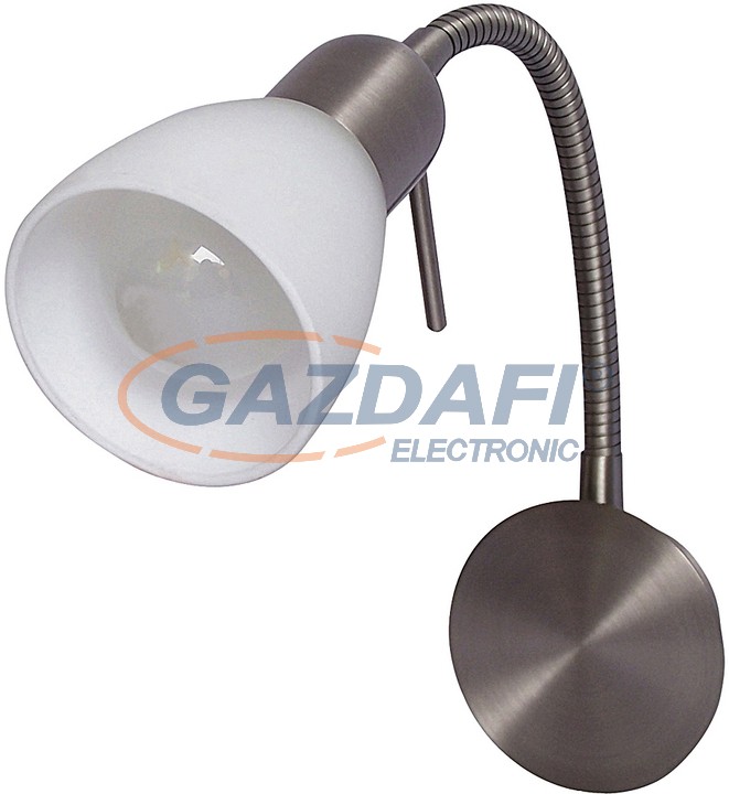 Időtlen stílusú spotlámpa 1 darab foglalattal, hálózati vezetékkel, kapcsolóval és dugvillával. 20.5 cm magas, szatin króm színű fém szerkezet és gégecsővel pozícionálható lámpatest, fehér színű üveg búrával, IP20-as védelemmel. A lámpatest E14-es foglalatú, max. 40W teljesítményű, halogén vagy energiatakarékos fényforrással is használható.