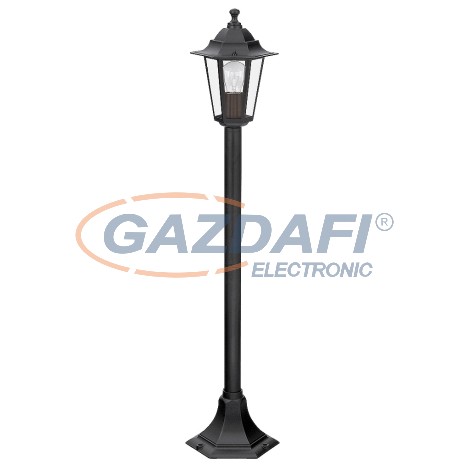 Klasszikus megjelenésű kültéri állólámpa 1 db foglalattal. 105 cm magas, 21 cm átmérőjű, fekete színű fém lámpatest és víztiszta üvegbetétes lámpabúra, IP43-as védettséggel. A lámpatest E-27-es foglalatú, max. 60W teljesítményű energiatakarékos fényforrással is használható.