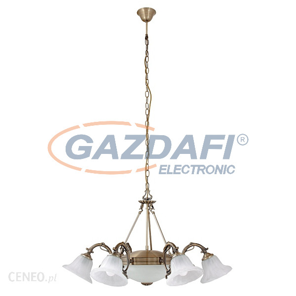 Klasszikus megjelenésű csillár 6 db foglalattal. 100 cm lelógású, 84 cm átmérőjű, bronz színű fém lámpatest és alabástromüveg lámpabúrák. A függeszték központi lámpateste E27-es foglalatú, max. 2x 60W teljesítményű, míg karjai E14-es foglalatú, max. 6x 40W teljesítményű fényforrásokat fogadnak. A lámpatest energiatakarékos fényforrásokkal is használható.