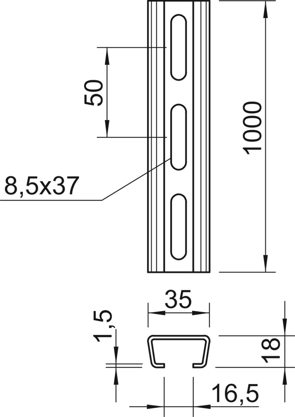OBO 1119646 AML3518P1000FS Profilsín, perforált AMS3518, 16,5 mm résszélesség, 1000mm szalaghorganyzott acél [FAD]