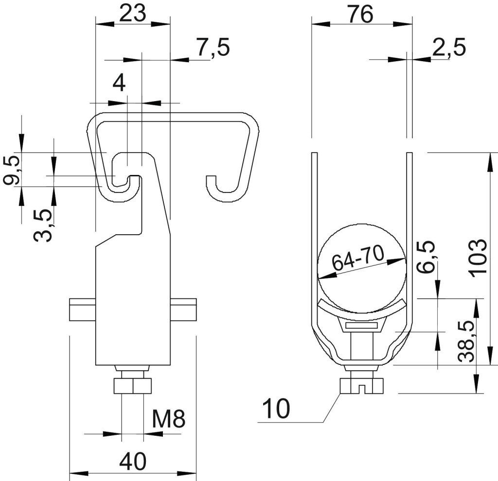 18 és 22 mm-es résszélességgel rendelkező C profilsínhez alkalmazható. 4 - 12 mm anyagvastagságú lapos-, szög- és U-vashoz is megfelelő. Merítetten tűzihorganyzott acél bilincs és csavar. Halogénmentes polipropilénből készült, RAL 7035 világosszürke színű nyomóvályú.