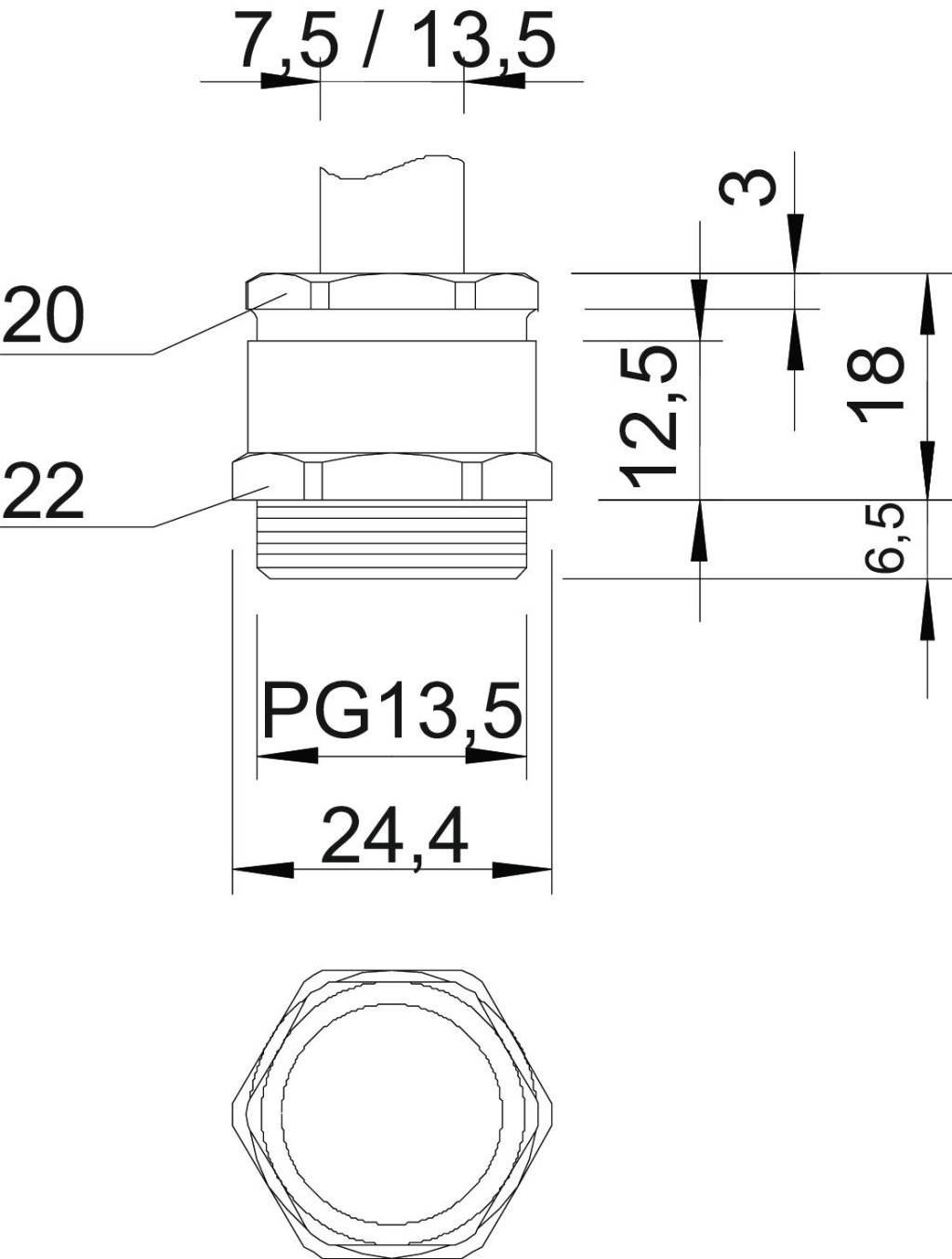 Hatlapú közbenső csonkkal ellátott tömszelence. DIN 46320 szerinti C4 alak, DIN 40430 szerinti PG-csatlakozómenettel. Galvanikusan horganyzott és átlátszóra passzivált acél nyomógyűrűk. NR/SBR anyagú tömítőgyűrű. Védettség: csatlakozómenet tömítőgyűrűvel IP65, csatlakozómenet tömítőgyűrű nélkül IP54. Többrétegű gyűrűs tömítéssel.