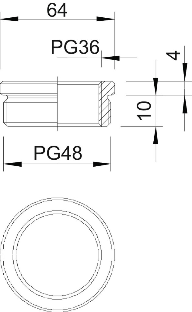 DIN 46320 szerinti szűkítőelem (H alkatrész), DIN 40430 szerinti páncélmenettel, közbenső elemként egy páncélmenetes furattól egy kisebb tömszelencére.