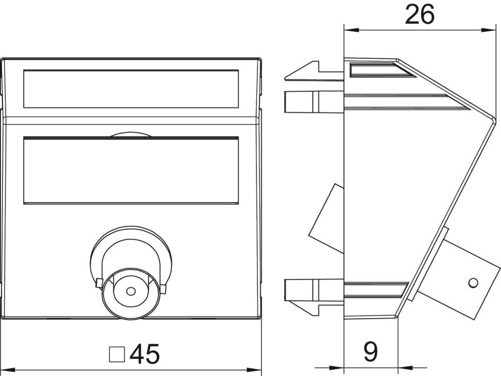 Multimédia tartó BNC csatlakozó aljzattal, ferde kivitel, felirati mezővel, BNC átvezető, aljzat-aljzat kivitelben. A bepattinható rögzítés normál és 90 fokkal elforgatott beépítést is lehetővé tesz.