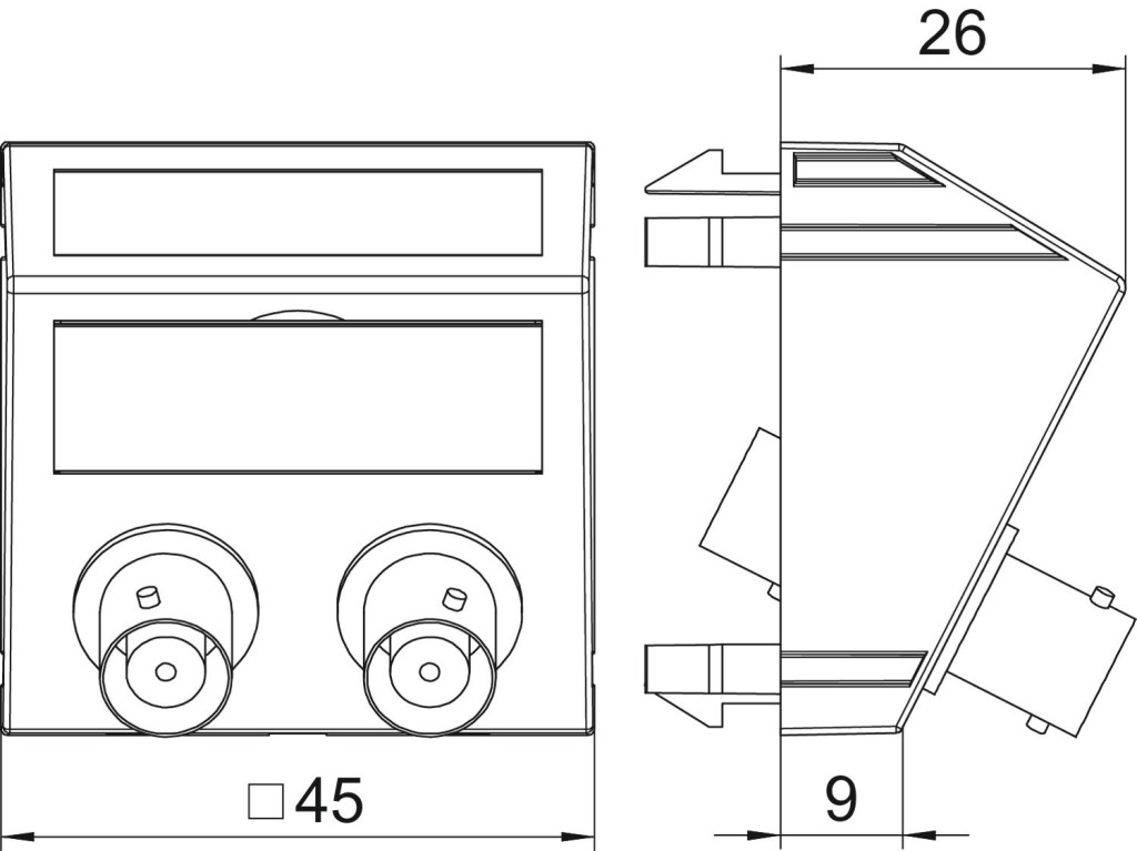 Multimédia tartó 2 db BNC csatlakozóval, ferde kivitel, felirati mezővel, kettő átvezetős csatlakozóval (BNC), aljzat-aljzat kivitel. A bepattinható rögzítés normál és 90 fokkal elforgatott beépítést is lehetővé tesz.
