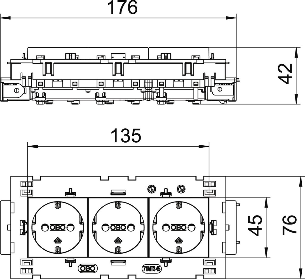 hármas, 0°-os oldalsó csatlakozású védőérintkezős csatlakozóaljzat, fokozott érintésvédelemmel, nyomórugós csatlakozókapcsokkal, 2P+F, 16 A, 250 V~, IEC 60884-1 szerinti összekötő kapcsokkal, Rapid80 szerelvénybeépítő csatornába történő szereléshez.