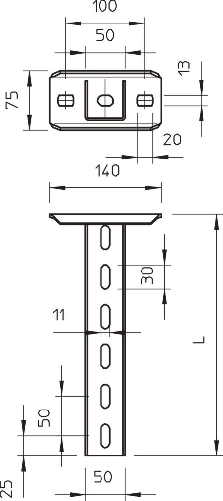 53 x 50 mm méretű függesztett oszlop (U-profil) ráhegesztett fejlemezzel. Vízszintes betonfödémre és acéltartókra történő rögzítéshez. A függesztett oszlop mindkét oldalán, illetve az oszlop végén történő konzolszerelésnél a DSK 45 típusú távtartót minden 耀?養ö ะ▩翹