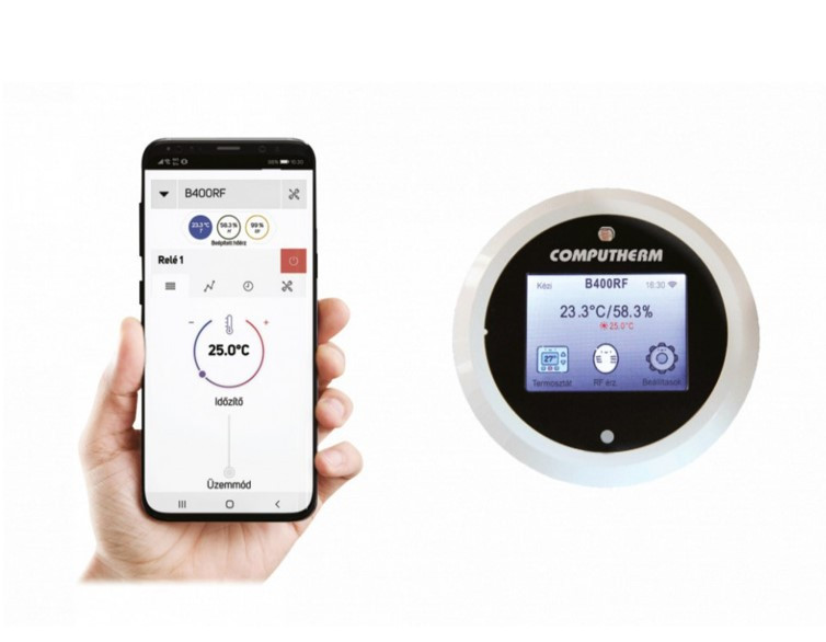 A COMPUTHERM B400RF típusú Wi-Fi termosztát egy interneten keresztül okostelefonról, tabletről és számítógépről is vezérelhető, vezeték nélküli kapcsolóüzemű készülék, melyet elsősorban a központi fűtések és elektromos készülékek vezérlésére ajánlunk. Egyszerűen csatlakoztatható bármely, kétvezetékes szobatermosztát csatlakozási ponttal rendelkező gázkazánhoz, klímaberendezéshez, egyéb elektromos készülékhez függetlenül attól, hogy az 24 V-os vagy 230 V-os vezérlőáramkörrel rendelkezik.